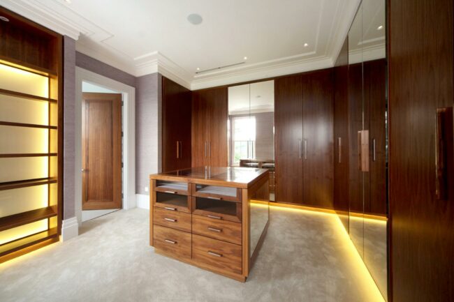 Full room dressing area fitted with custom units and a storage centrepiece.